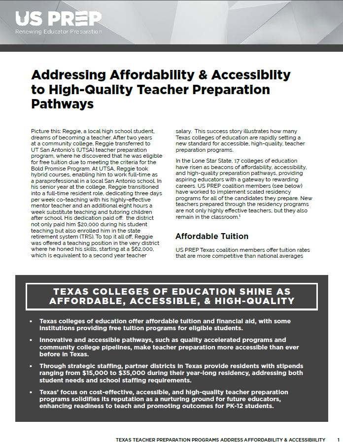 The University-School Partnerships for the Renewal of Educator Preparation (US PREP) National Center provides on-the-ground support and services to a coalition of university-based teacher preparation programs. The current coalition comprises school-university partners with a common mission of attracting, training and retaining high quality teachers for underserved communities across the country. Our ultimate goal is to positively impact K-12 students by building teacher candidate content knowledge and competency to meet ALL students where they are and advance their learning by giving them what they need — especially focused on students who have been historically marginalized.