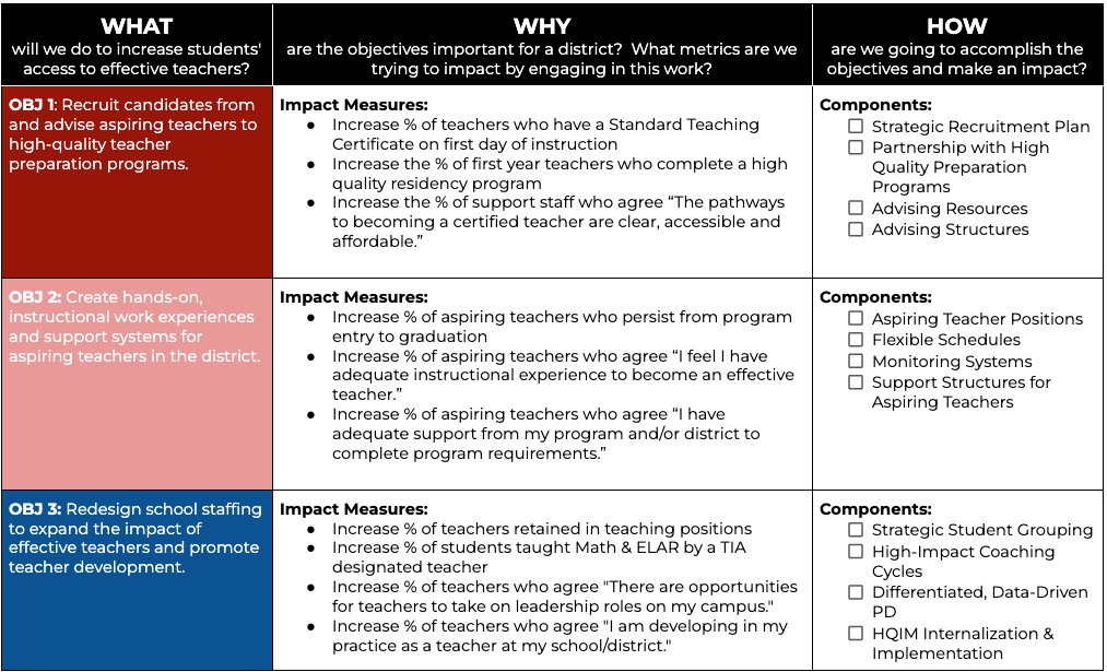 The primary objective of Pipeline to Leadership Strategic Staffing is to develop a holistic approach to teacher recruitment, development, and retention, with a focus on: